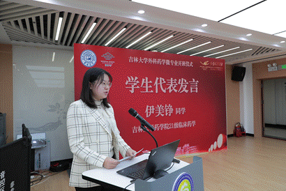 22 级临床医学 5+3 专业的刘洺菀同学分别代表临床药学和临床医学学生发言,从药学生和医学生的不同视角表达了对外科药学微专业学习的认识,期待通过外科药学丰富多样的课程,夯实自己的专业底蕴,实现医学梦想。
