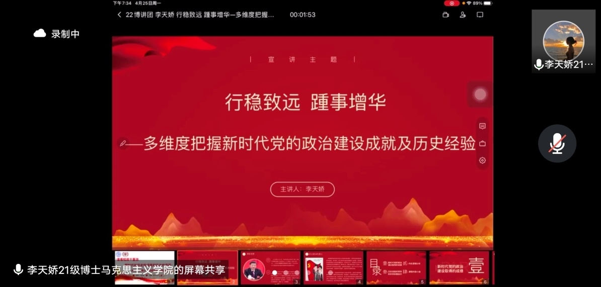 2021级博士研究生李天娇主讲的以《多维度把握新时代党的政治建设成就及历史经验》为主题的相关报告。