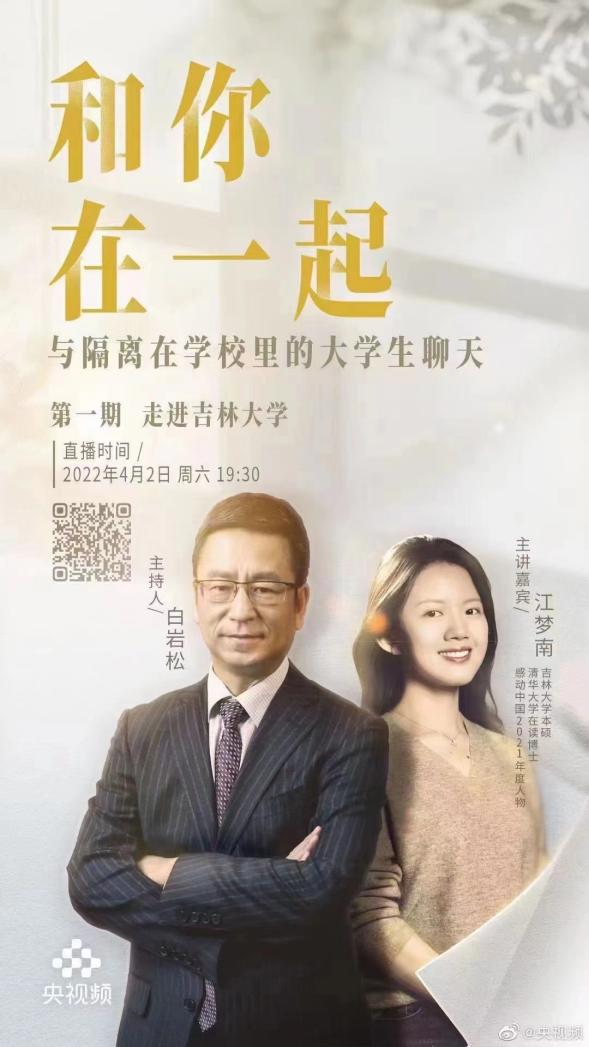 目前,我国本土疫情形式还较为严峻,多省面临着同时段多地市发生奥密克戎疫情的防控局面。中央广播电视总台为缓解在疫情防控期间全国高校封闭管理期间学生的焦虑,携手主持人白岩松,联合各方资源发起“云陪伴”项目,邀请各行业杰出人物和优秀校友等进行分享直播,开展“和你在一起”特别行动。