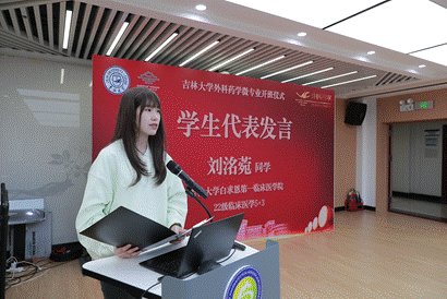 22 级临床医学 5+3 专业的刘洺菀同学分别代表临床药学和临床医学学生发言,从药学生和医学生的不同视角表达了对外科药学微专业学习的认识,期待通过外科药学丰富多样的课程,夯实自己的专业底蕴,实现医学梦想。