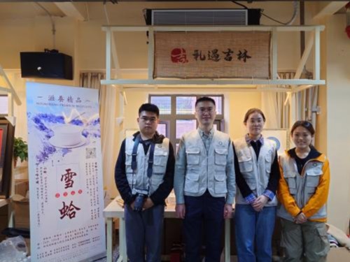 药学系王志寒副教授带领3名学生实践团成员进行林蛙精深加工系列产品(如银耳炖雪蛤、雪蛤双肽饮和雪蛤参茸养生酒等)和学术成果展示,吸引了众多参会人员和企业代表驻足交流。同时,王志寒还通过线上直播,带领网友“云逛展”,以深入浅出的语言,生动讲述了林蛙油的悠久历史、独特功效及系列产品的研发理念。直播中,他重点介绍了团队如何运用现代科技手段对林蛙资源进行深度开发,将传统药材转化为契合现代健康需求的高附加值产品,吸引了大量线上观众互动围观。