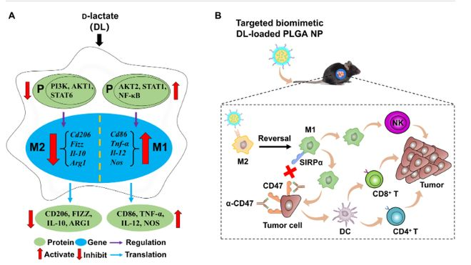 最近有报道称,肠道微生物组小分子代谢物 d-乳酸(DL)通过门静脉进入肝脏,增强了 库普弗细胞(肝脏驻留巨噬细胞)促进清除血液中病原体的能力。由于 DL 增强了 库普弗细胞的吞噬功能(M1 巨噬细胞的一个关键特征),我们推测 DL 可使 M2 TAMs 极化为 M1 TAMs,并重塑 HCC 的免疫抑制 TME。在本研究中,DL使TAMs从M2转向M1,这主要是由于抑制了磷脂酰肌醇3-激酶(PI3K)/蛋白激酶B(Akt)通路和激活了核因子κB(NF-κB)通路。